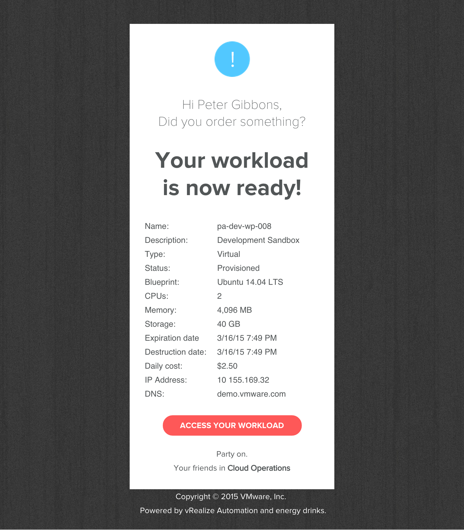 The messages that appear in the inbox of the user are part of the experience. VMware vRealize Automation can send automatic notifications for several types of events, such as, the successful completion of a catalogue request or a required approval workflow. System Administrators can configure global email servers, senders and recipients that process email notifications.