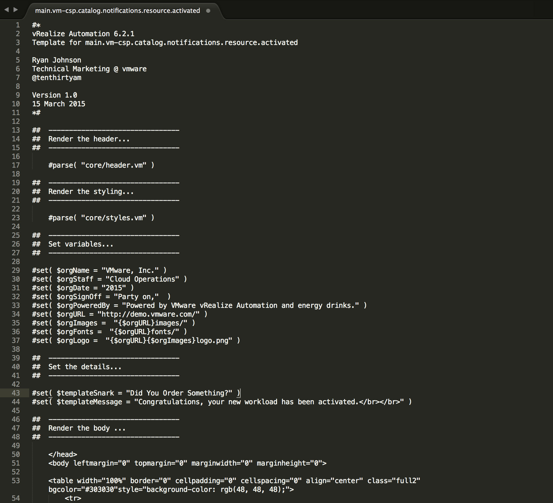 vRealize Automation uses a folder structure to determine the appropriate template to user based on the context of the tenant. Templates files are written in Apache Velocity, an easy to use Java-based template engine. Learn more about the simple directives used in the .vm template files in the Apache Velocity User Guide.