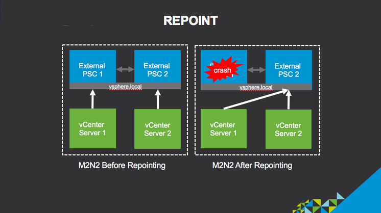The reconfiguration enhancement enables you to take an existing embedded deployment and transition it to a more optimal external deployment model – MxN.  There is also the simplified ability to repoint a management node to another Platform Services Controller which enables you to quickly recover from an external Platform Services Controller failure and to distribute load to alternate nodes that are in the same SSO domain.